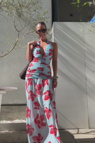 The Chloe Floral Halter Mesh Plunge Maxi Dress – Blue Pink blends feminine charm with effortless sophistication. Cut from sheer stretch mesh in a romantic floral print, this halter-neck gown drapes beautifully over the body to accentuate natural curves. The cowl neckline and open back evoke easy glamour, while the unlined single-layer skirt moves fluidly with every step. Designed for summer weddings, resort nights, and elevated occasions, it delivers comfort and polish in one modern silhouette.