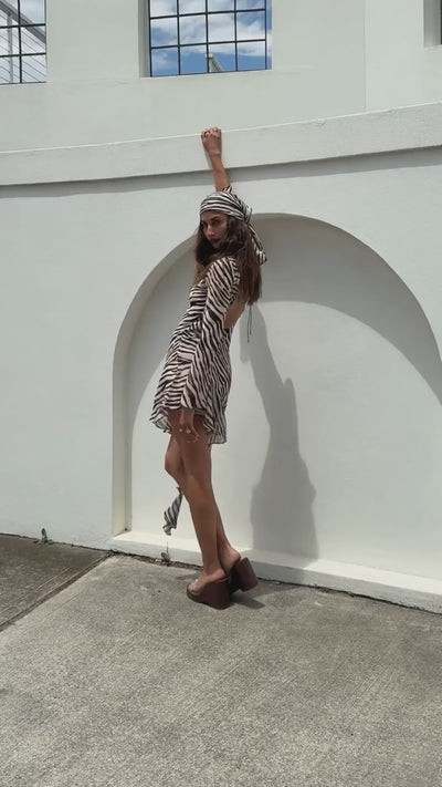 The Gigi Zebra Long Sleeve Mini Dress in Chocolate & White delivers statement sophistication in a versatile resort silhouette. The bias-cut mini drapes fluidly across the body, creating natural movement and a flattering fit. Designed for warm days and elevated nights, it’s a refined take on animal print with a contemporary Suboo edge.