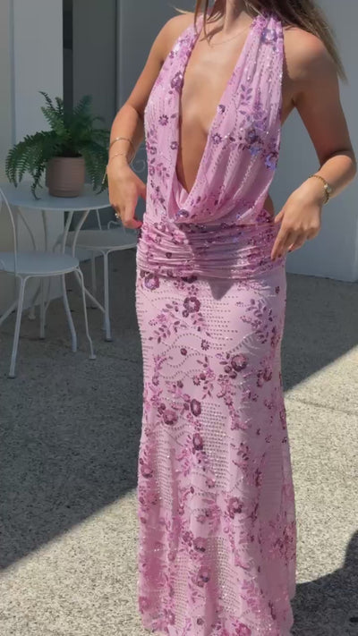 The Olena Dress is a statement full-length gown crafted from sheer mesh and intricately hand-embellished with shimmering beadwork throughout. Featuring a soft draped cowl neckline and flattering ruched waist detailing, this design contours the body while maintaining fluid movement. Finished with a subtle train, Olena embodies timeless glamour with a modern, feminine edge.